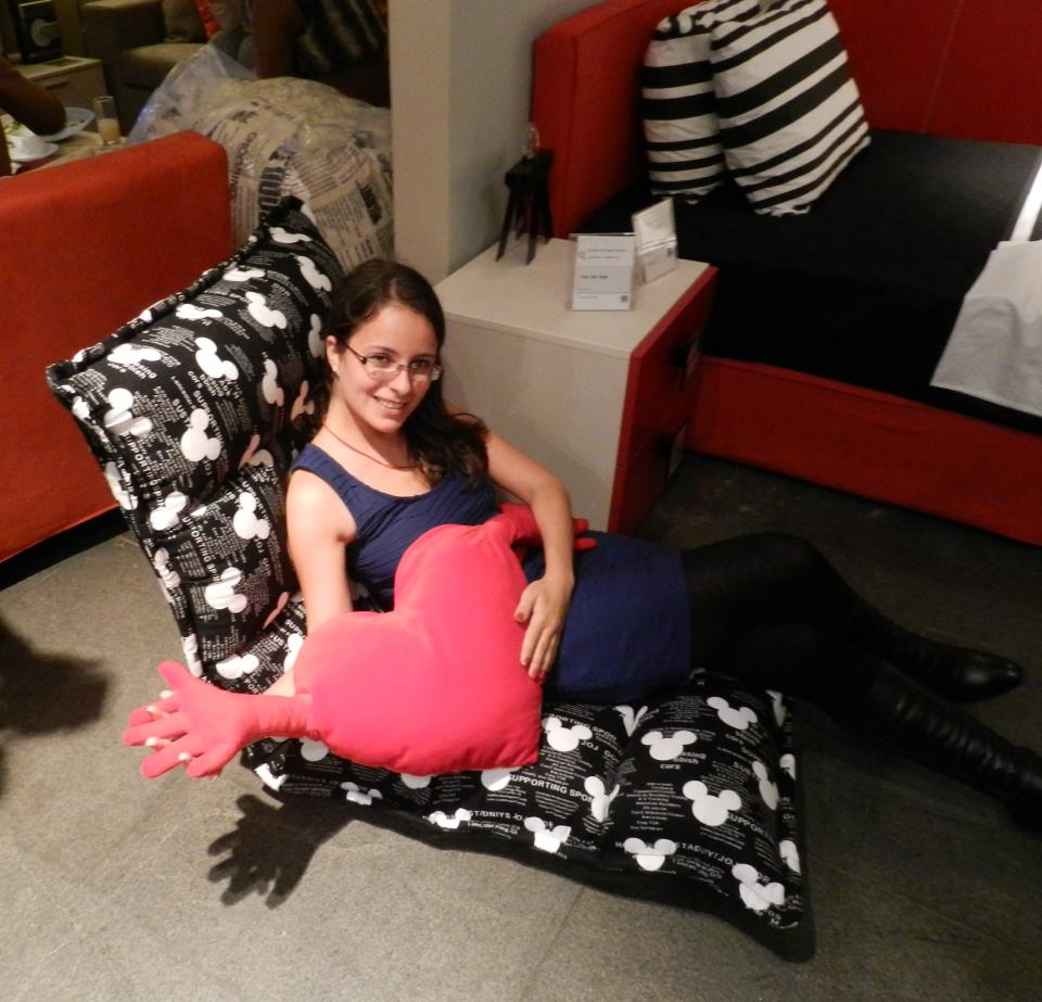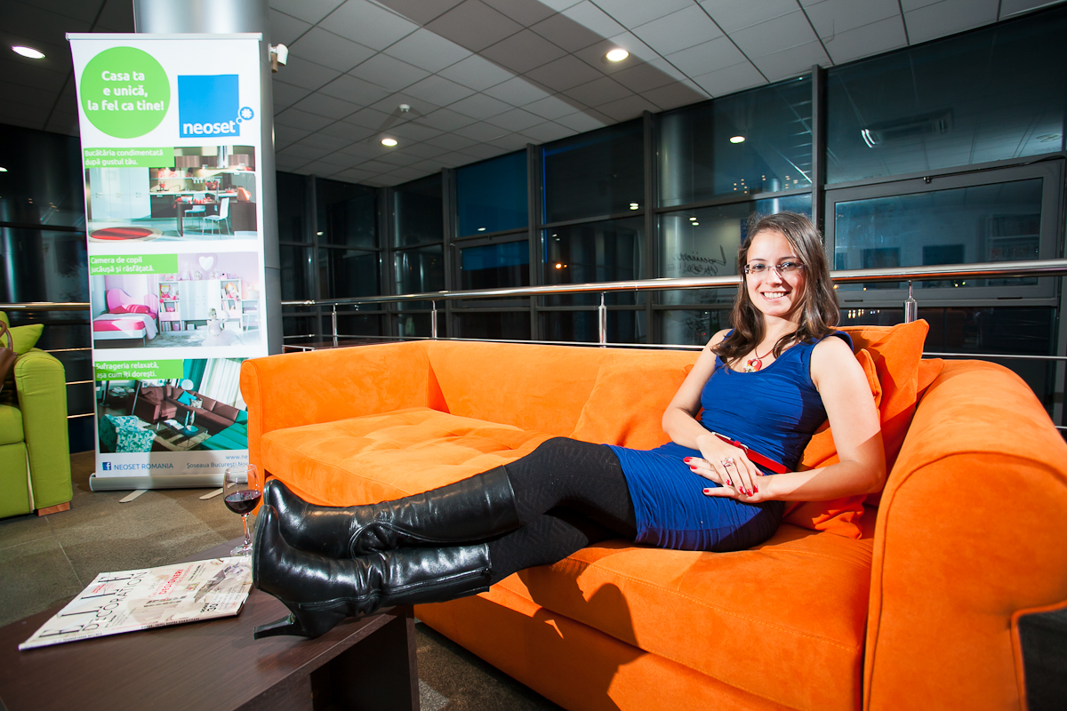 Logic ca am gasit o ocazie sa ma pozez pe cea mai frumoasa canapea de acolo. Si chiar daca e portocalie, pot sa o murdaresc cat vreau ca se sterge imediat (am desenat, ne-am distrat si am sters, pe incercate!).