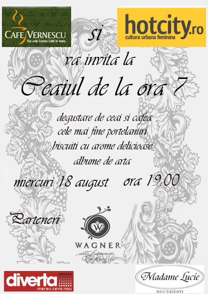 Hotcity si Alina Constantinescu au organizat o intalnire superba la Casa Vernescu de la Casino Palace. Evenimentul a fost conceput ca un „Ceai de la ora 7” dat fiind faptul ca ora 17 era incomoda pentru muncitorii zilelor noastre.