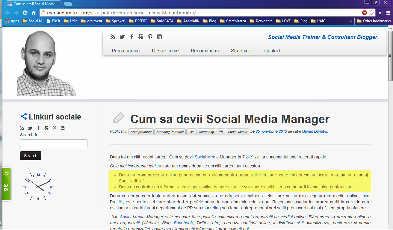 Pe 25 noiembrie, Marian Dumitru publica un articol cu titlul „Cum sa devii Social Media Manager”, print screen mai jos: