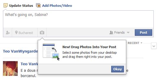 O alta modificare adusa de Facebook este cea legata de postarea pozelor pe wall-ul vostru (altfel decat prin postare albume foto). Acum avem optiunea de a pune mai multe poze la un status si chiar sa le „tragem” (sau „drag and drop), precum vedeti in imaginile de mai jos.
