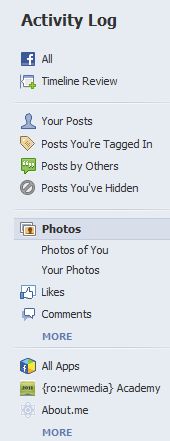 Modificari au fost aduse si la modul in care arata Activity Log. Acum aveti detaliate postarile voastre, cele care in care sunteti taguiti, cele ascunse dar si pozele (postate de voi sau altii), like-uri si comentariile date de voi pe Facebook si aplicatiile. E ca un fel de istoric al tuturor actiunilor voastre de pe reteaua sociala.