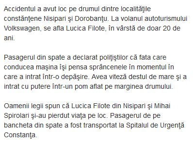 (…) Fata asta defapt se ducea sa se penseze…., baiatul care a supravietuit a coborat din masina si a spus ceva de genul „Lucico iti trebuia sa te pensezi” (…).