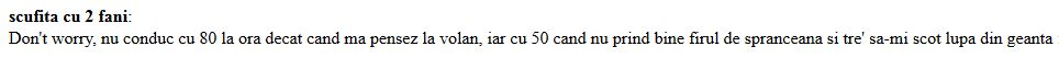 „Dragelor, cand va deranjeaza enorm de tare vre’un fir de spranceana pe care l-ati prins din viteza, (sic!) cu coada ochiului, in oglinda retrovizoare, se procedeaza in felul urmator, in functie de drumul pe care conduceti:
