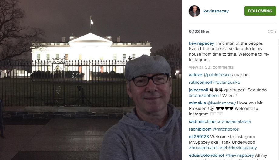 Kevin Spacey e pe Instagram și a postat prima poză și primul video. Și pentru că e el și nu ne poate dezamăgi nici aici, cum a intrat în lumea celei mai cunoscute aplicații pentru fotografii făcute cu telefonul? Cu un selfie în fața Casei Albe, normal!