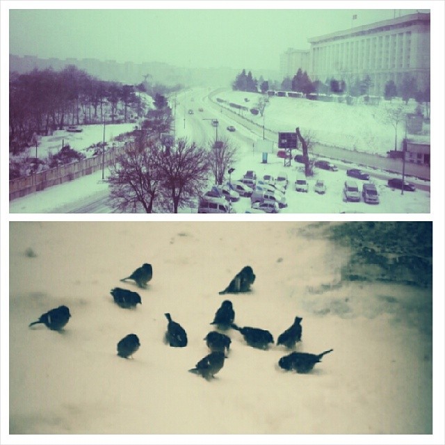 Si pentru ca imi place iarna, in ciuda vremii, am ales sa ma uit in jur. Liniste, pustiu pe strazi, totul acoperit de alb, masinile inghetate, in parc 2 copilasi se jucau, cainii se alergau prin zapada si pasarile luau masa.