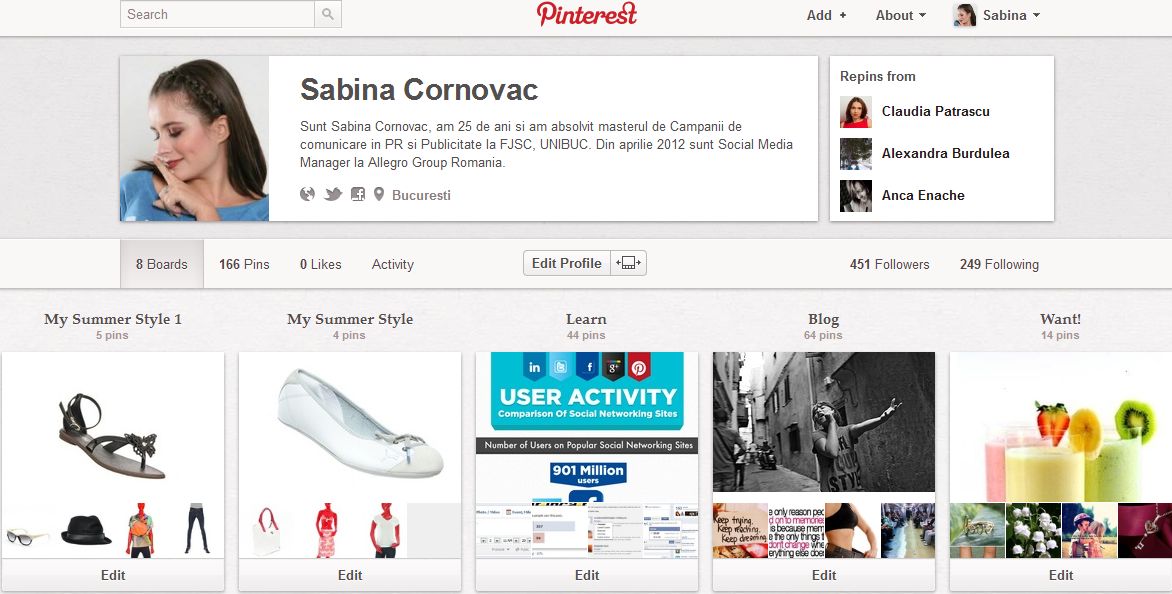 V-am mai scris aici despre Pinterest si modul in care a devenit pentru mine un agregator de bookmarks-uri, mai ales pe partea de social media. De fiecare data cand dau de un articol interesant, cu grafice, informatii, studii etc si nu am timp sa il citesc in acel moment, il pun in boardul Learn si il citesc cand pot. In rest, postez acolo pinuri din blogul meu si poze misto care imi plac mie.